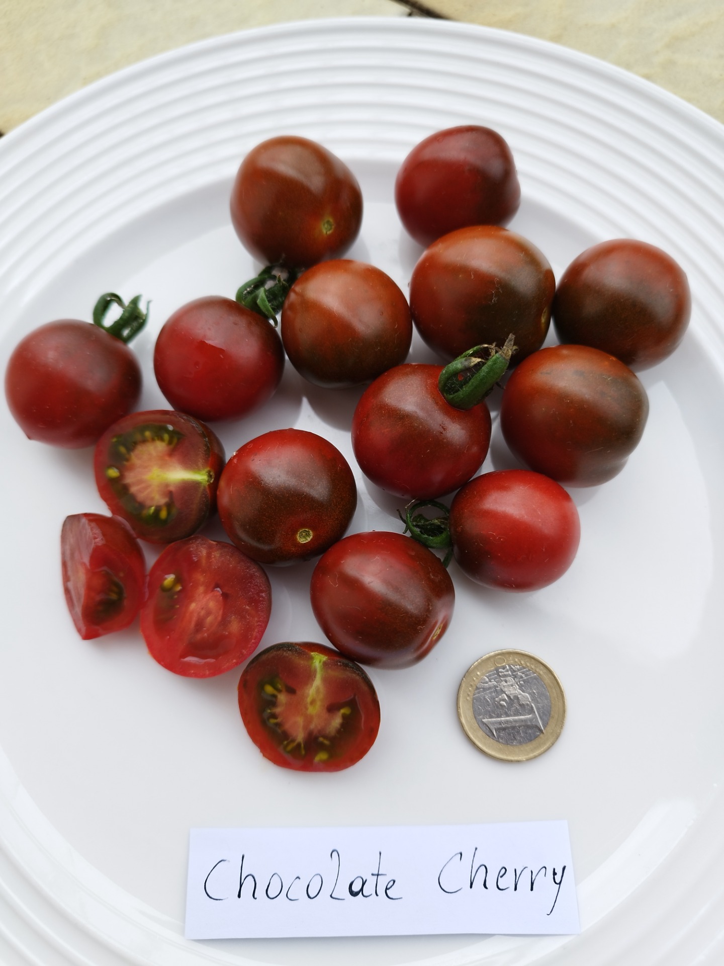 schoko-rotbraune Cocktail Tomate, rund, süß, sehr lange Ernteperiode, ertragreich, früh reifende Sorte mit dünner Schale, Wuchshöhe 1,5-1,8 m hoch