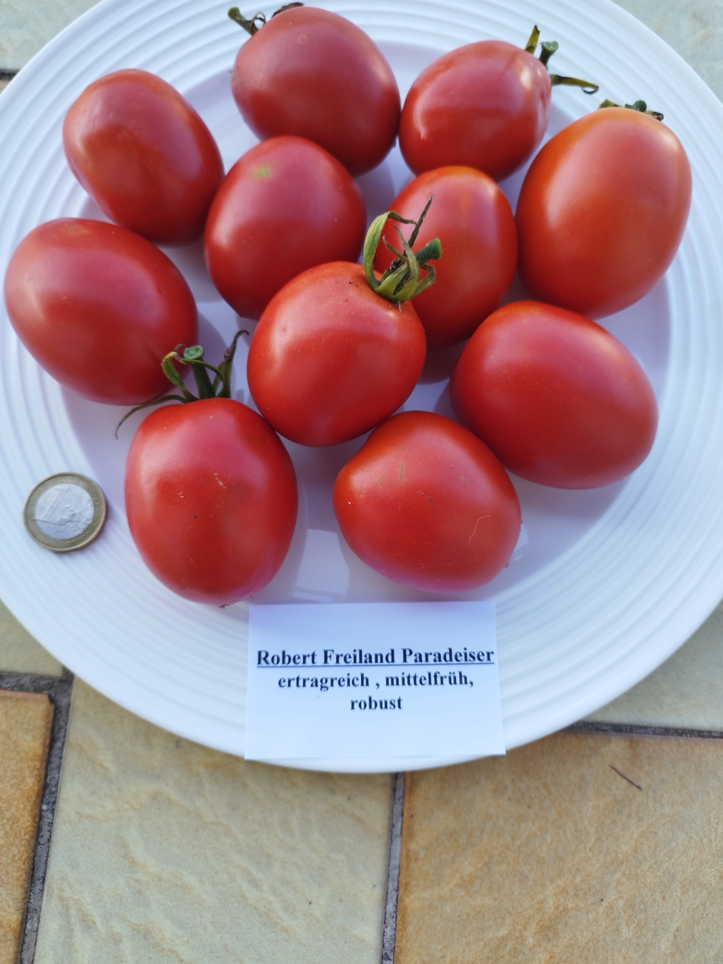 Sehr robuste bis zu Frost tragende Salat, Saucentomate, rote ovale Frücht 5-8cm groß, wird bis 1,8- 2 m hoch, festeres Fruchtfleisch mehrtriebig ziehen, sehr robust gegen Braunfäule, ertragreich Voranzucht: März- ab Mai ins Freie setzen