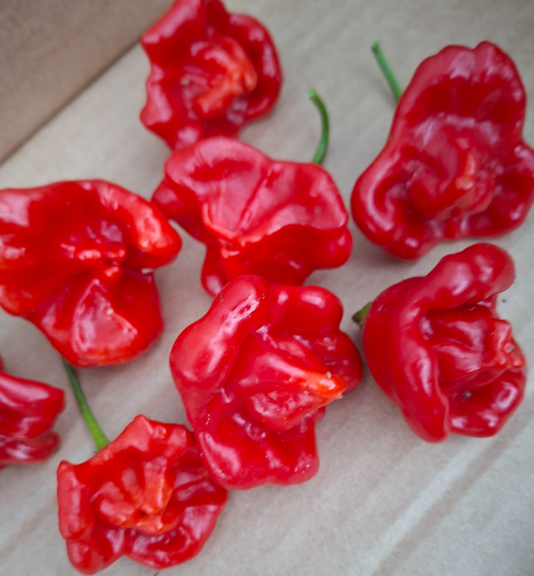 Glockenpaprika Schärfegrad 5-6 Rote Früchte hängen wie Glöckchen an der Pflanze, mild- zum Samengehäuse hin jedoch scharf, Pflanzenhöe 0,7mbis 1m hoch, Voranzucht im Februar, Keimth.25-27 Grad,-ins Freie pflanzen- ab Mai,