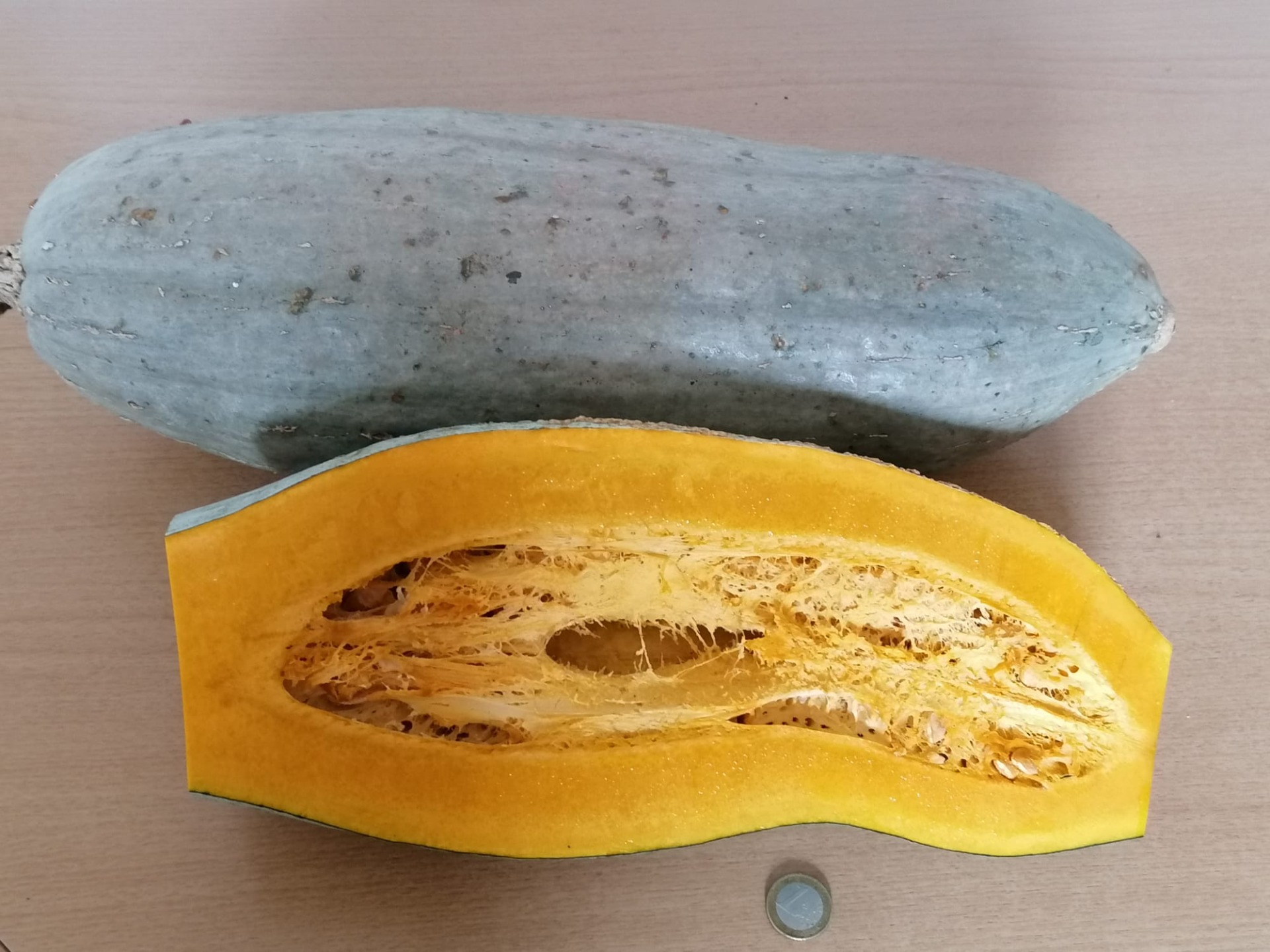 Bananenförmiger Kürbis mit länglicher Form, goldgelbes Fruchtfleisch, ca 2,5-3 kg schwer, sehr gute Lagerfähigkeit, sehr geschmacksvoll, diese Sorte ist seit 1893 bekannt