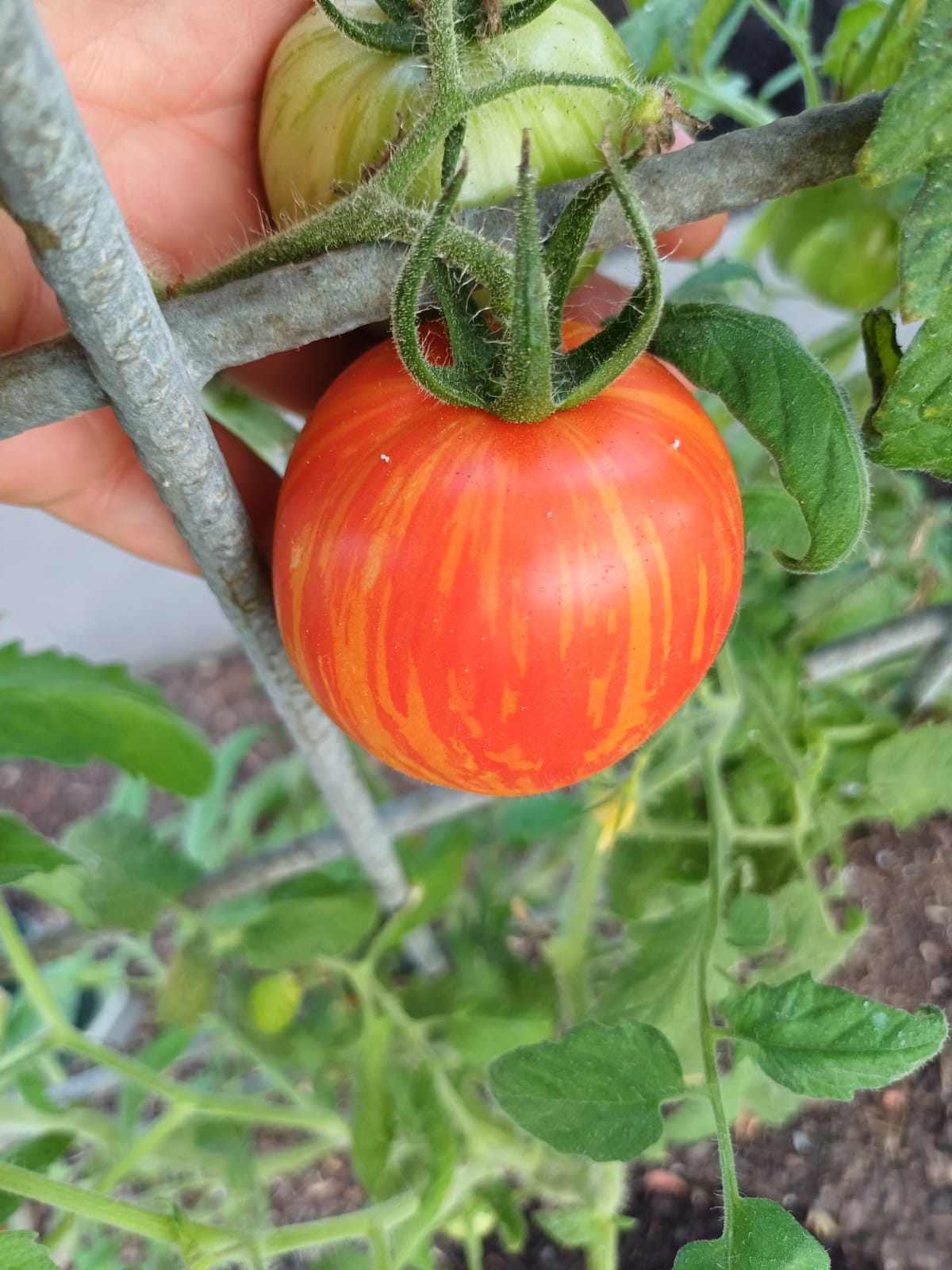 Rot gelb geflammt, sehr dekorativ, mild im Geschmack, aus dem Arche Noah Sortenarchiv, für Freiland Anbau, 5-7 cm groß, Wuchshöhe 1,5m hoch, frühe Sorte braucht 60 bis 70 Tage, stammt aus USA- Tom Wagner